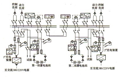 (3)方案三:單母線分段(一組蓄電池,兩套充電裝置)接線,見圖2-3。特點:接線可靠、靈活,一組蓄電池經兩個空氣斷路器分別接到兩段母線上。兩套相同容量的充電裝置接在不同