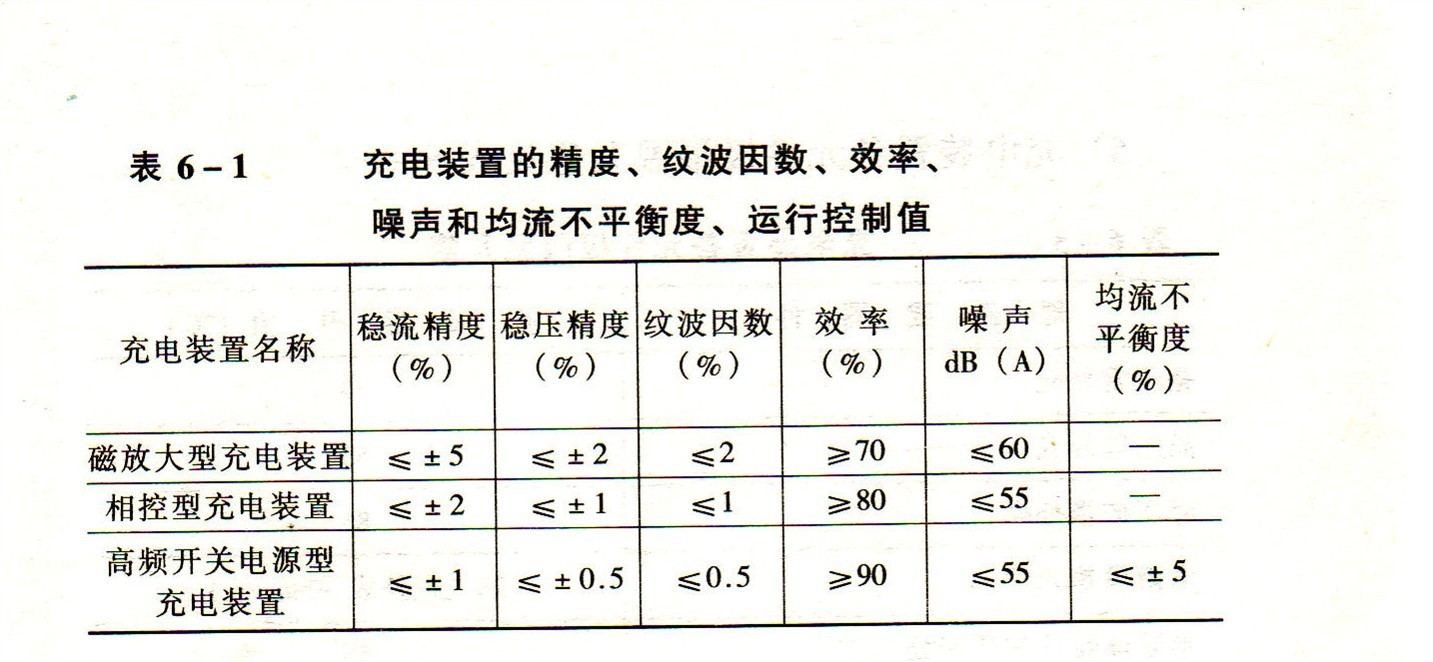 4)充電裝置的精度、紋波因數(shù)、效率、噪聲和均流不平衡度、運(yùn)行控制值,見表6-1.
